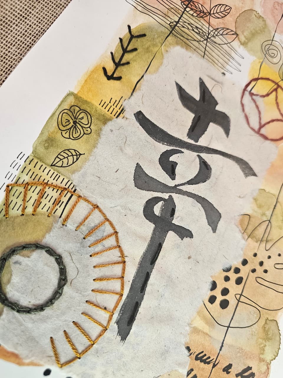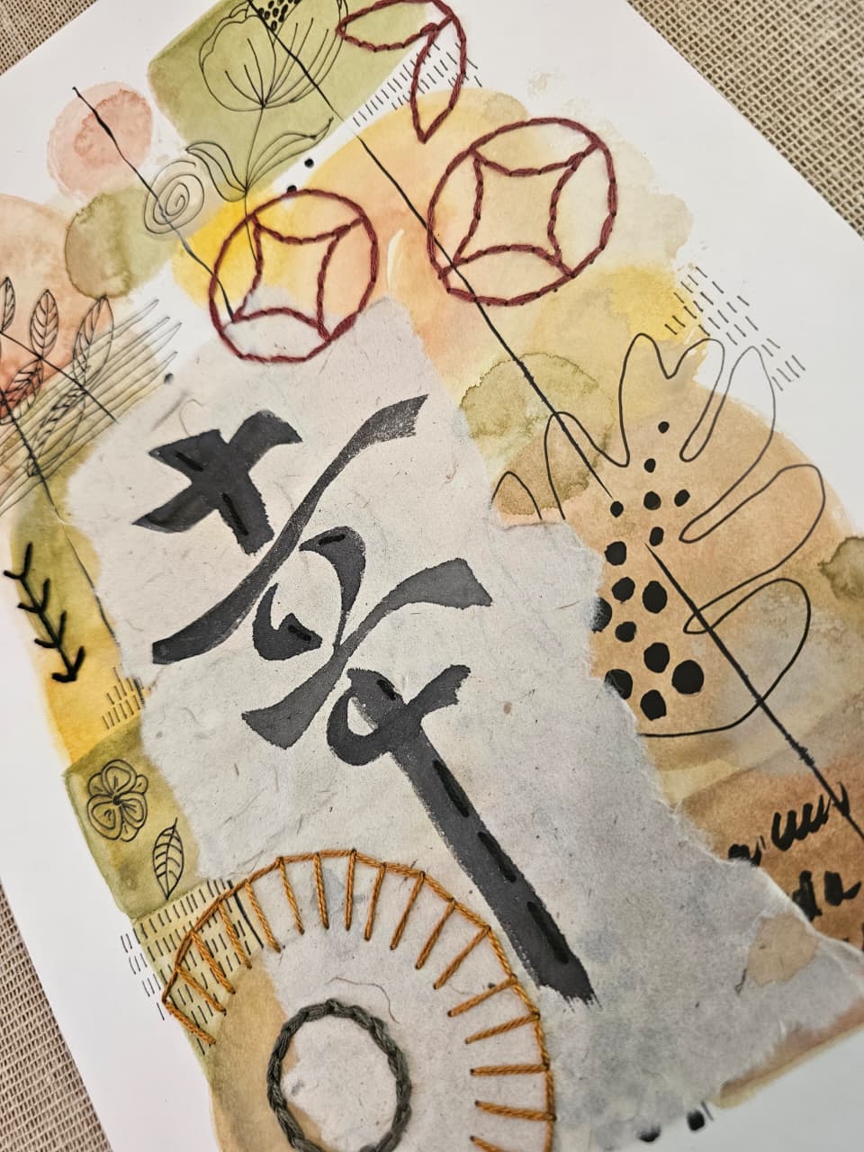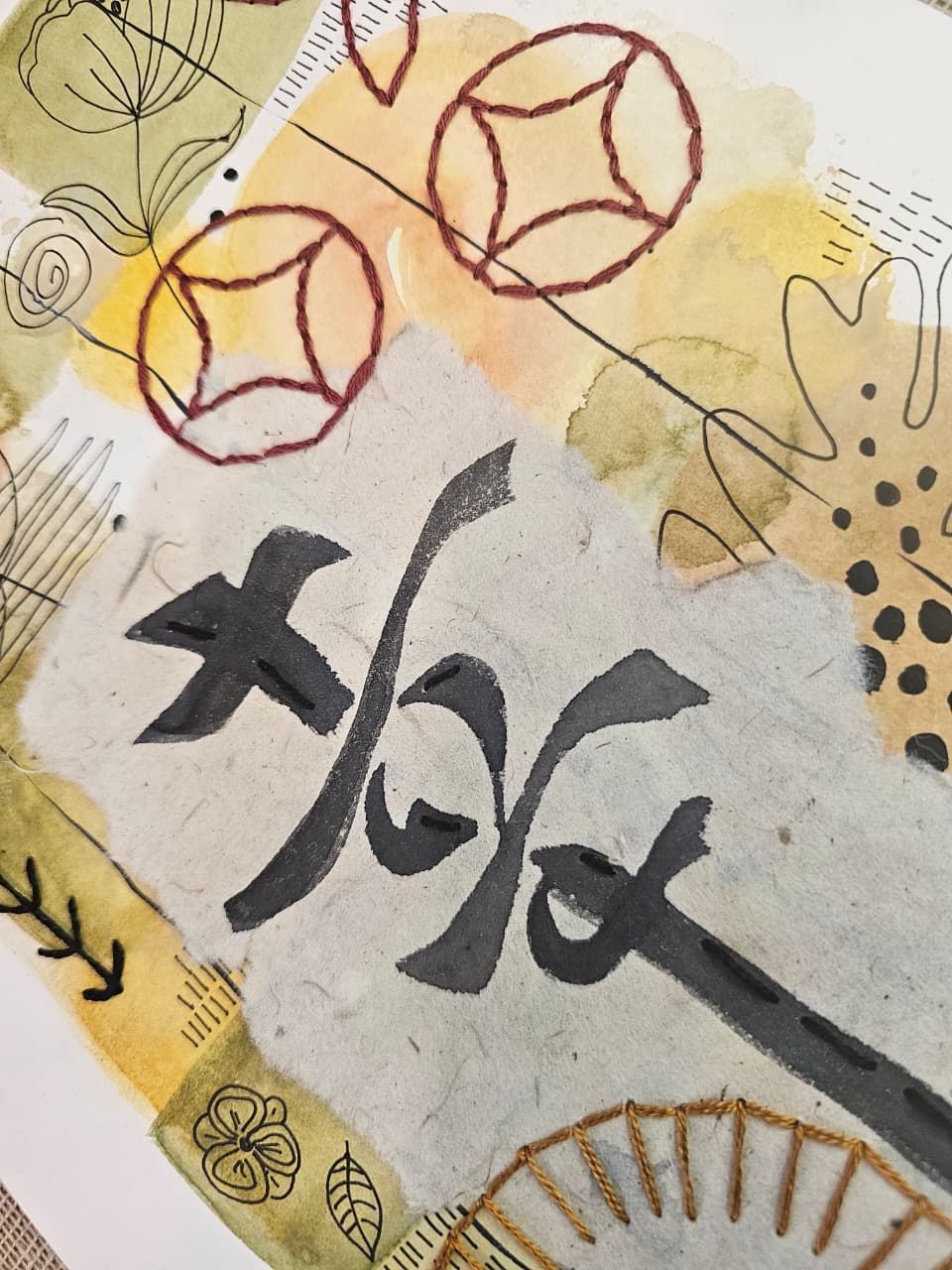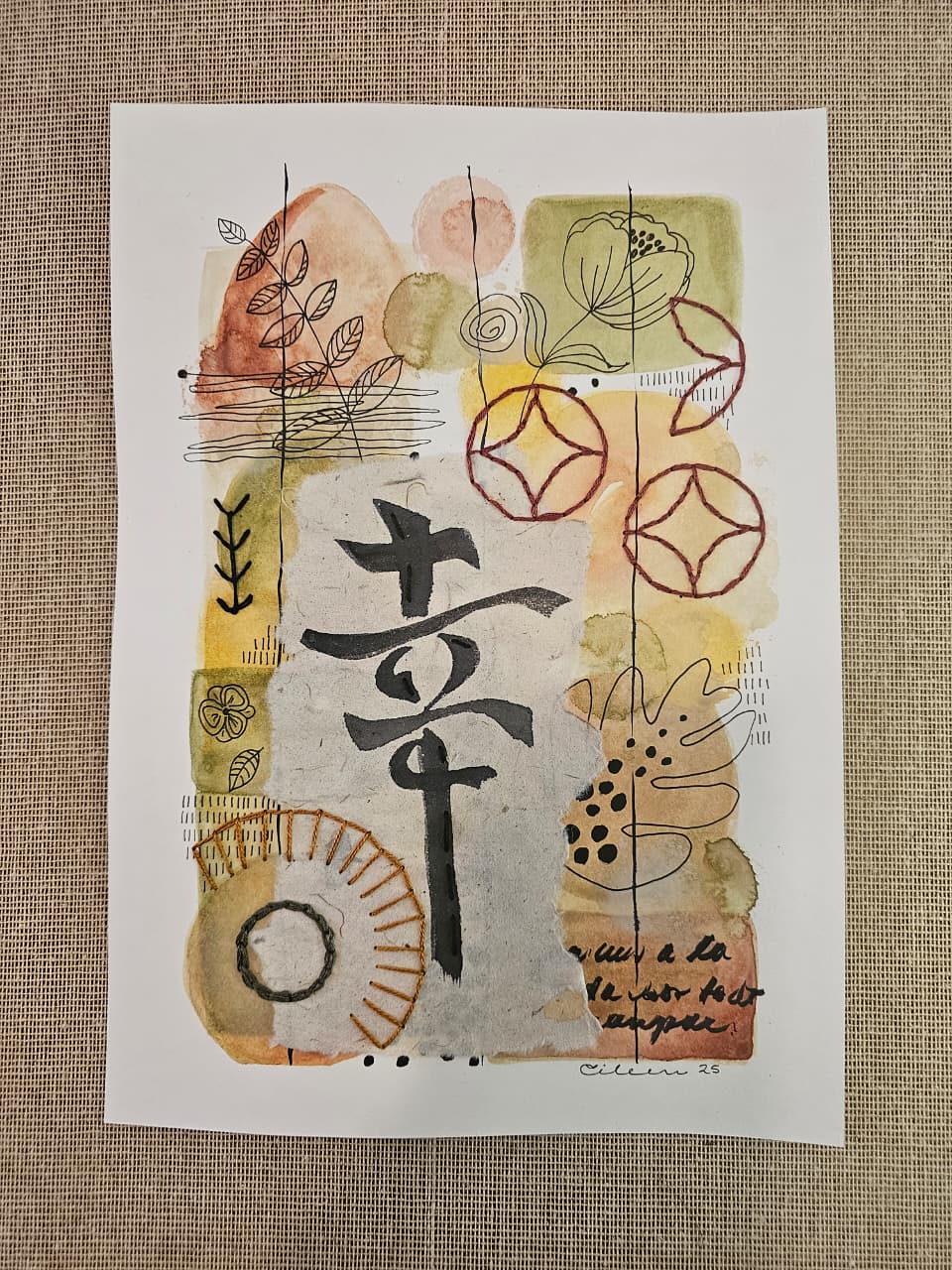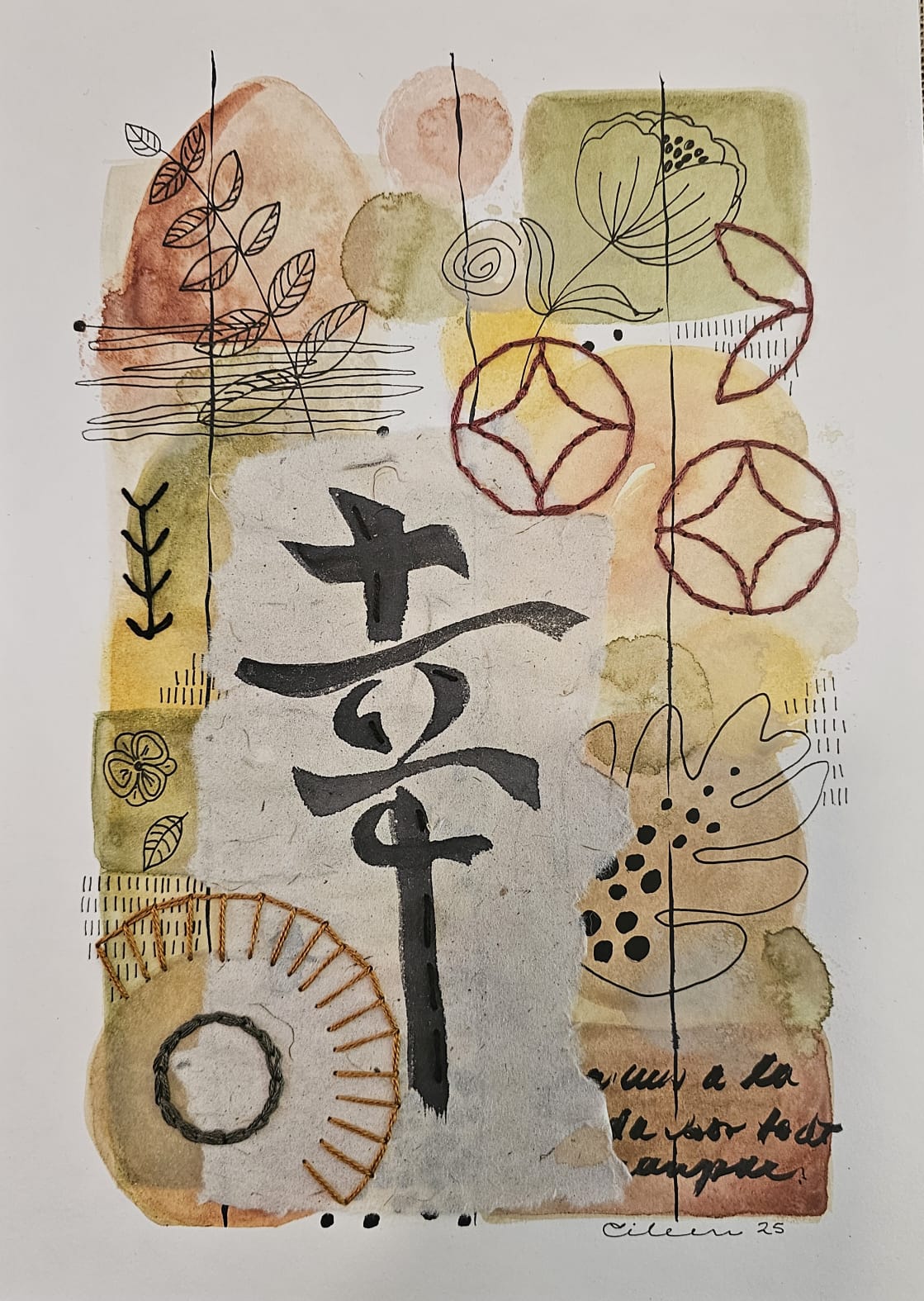 Acuarela sobre papel libre de ácido, con papel de arroz y bordado con hilo de algodón.