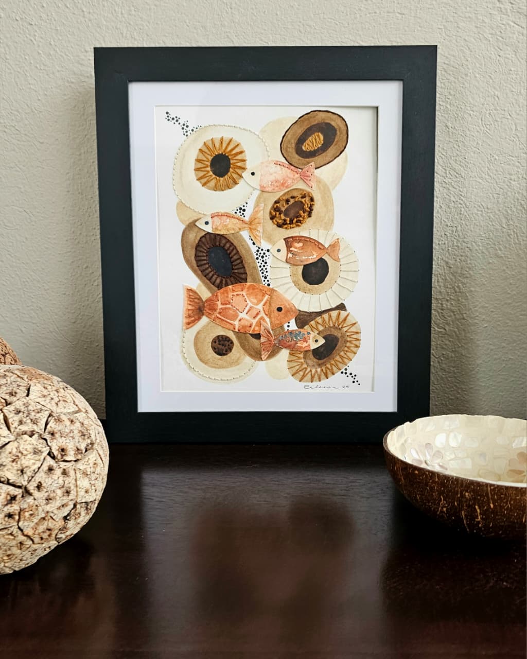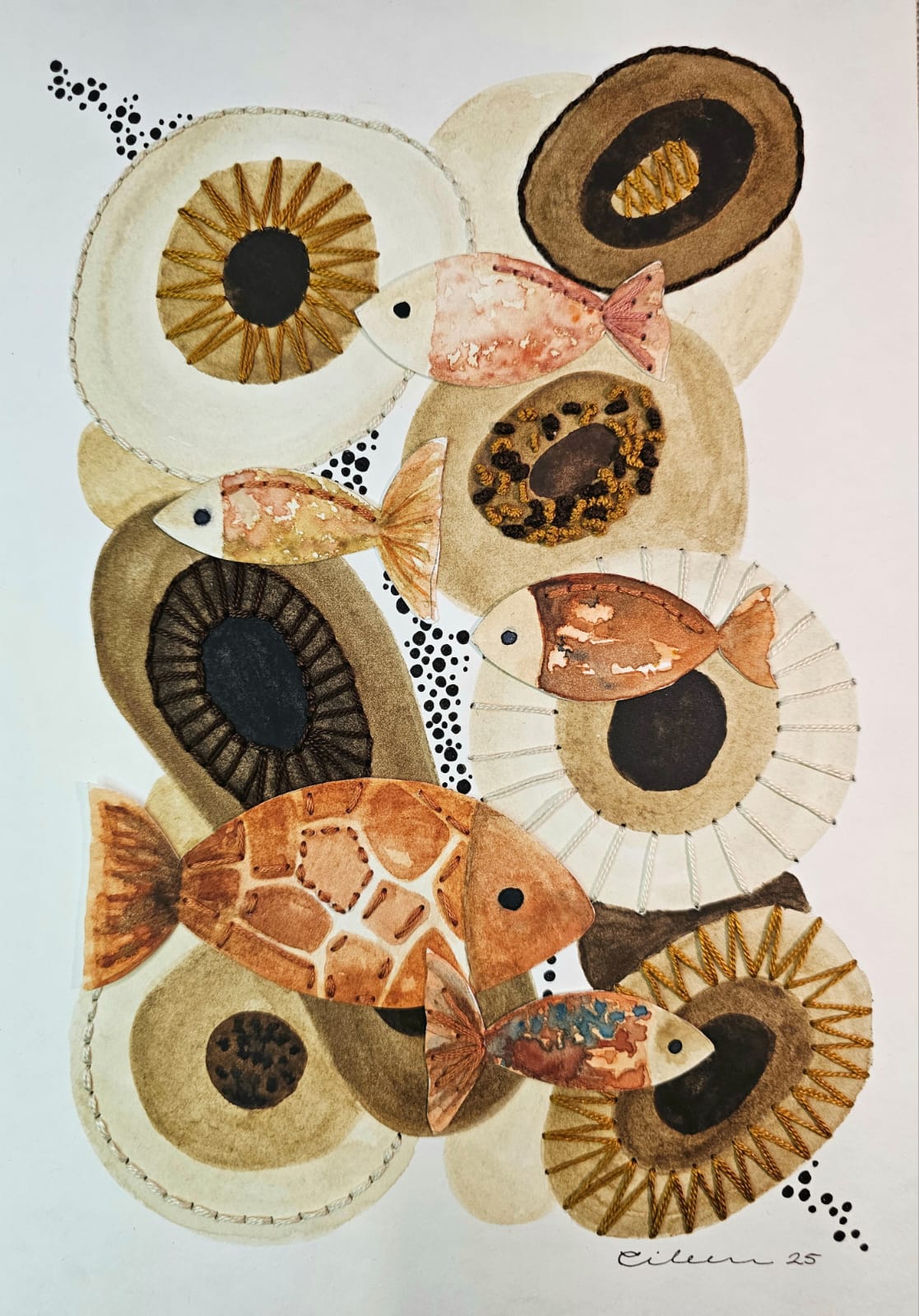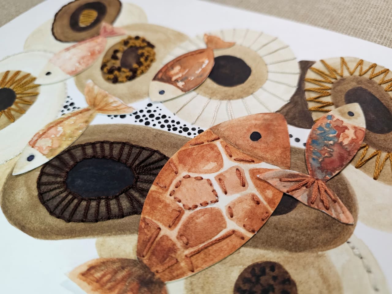 Acuarela sobre papel libre de ácido, bordado con hilo de algodón.