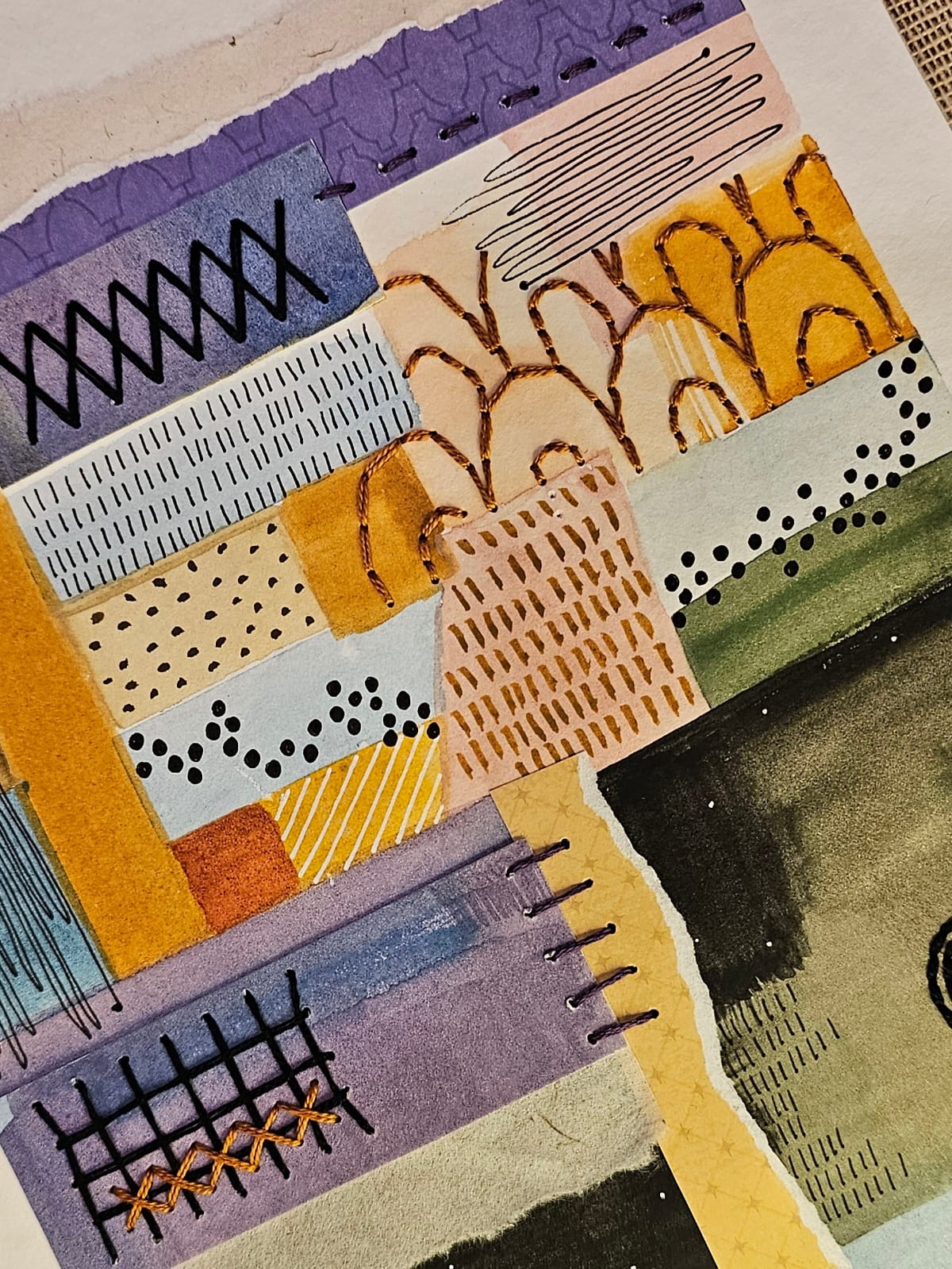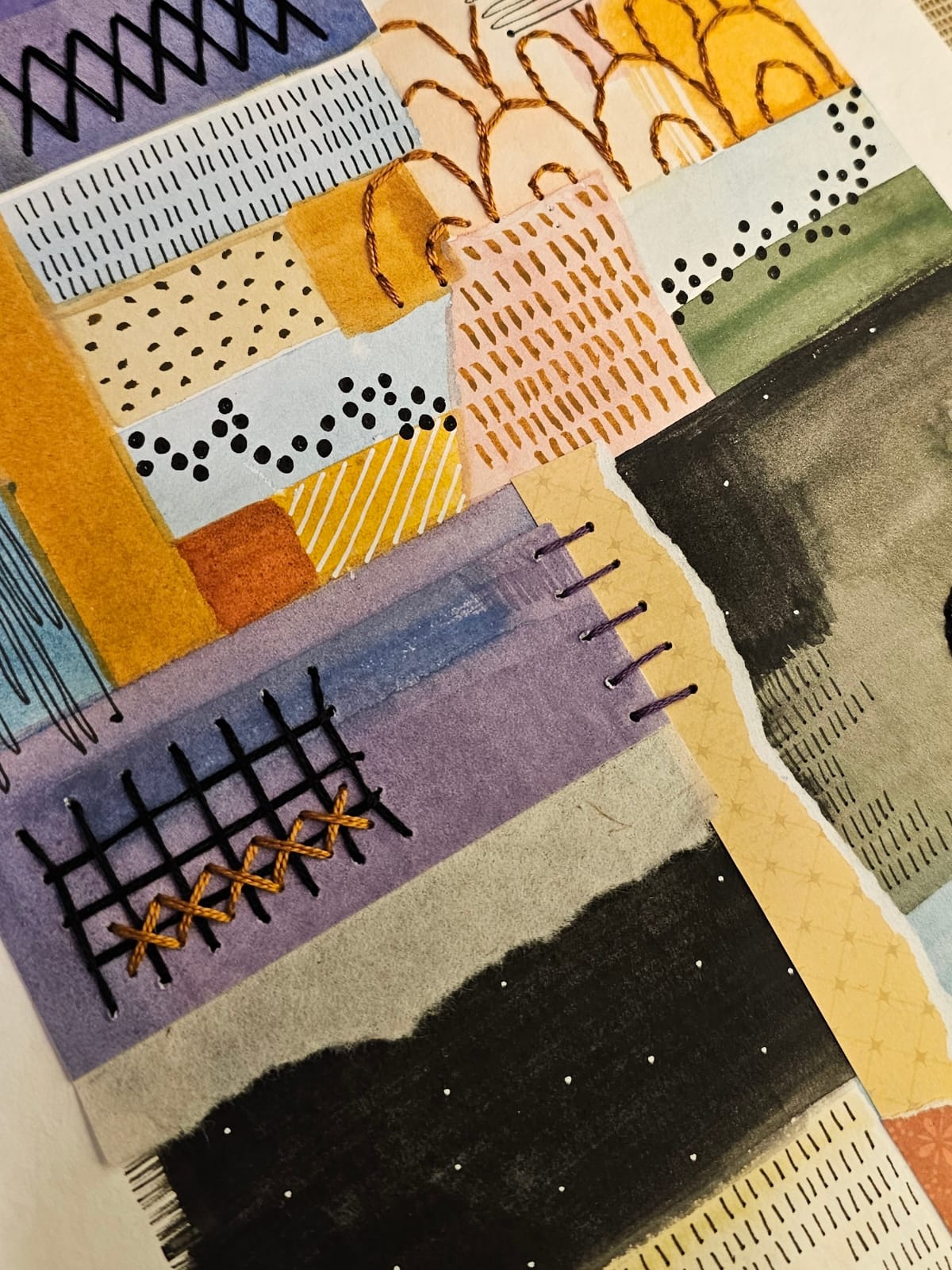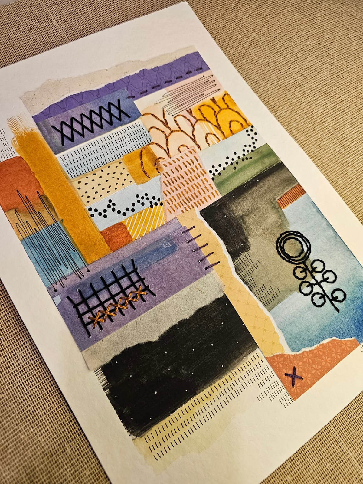 Tecnica mixta Acuarela.sobre papel libre de ácido, recortes de papel, bordado con hilo de algodón, tinta y acrílico.