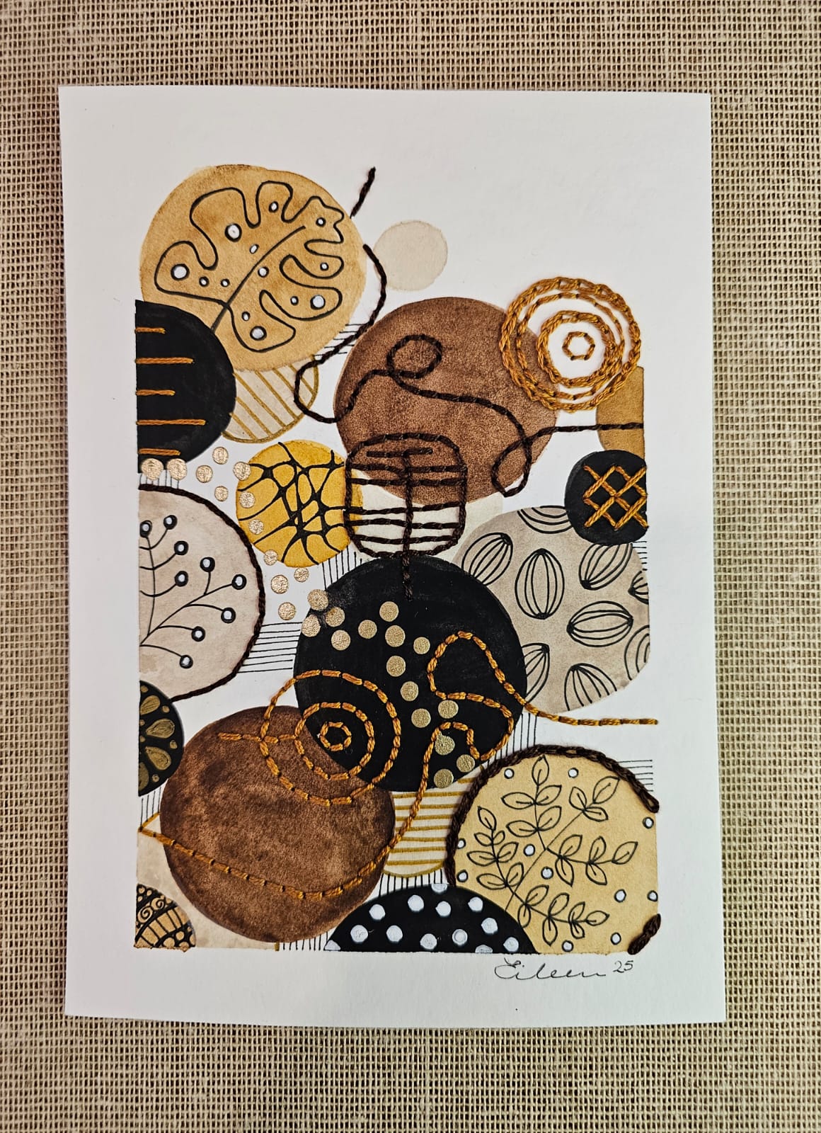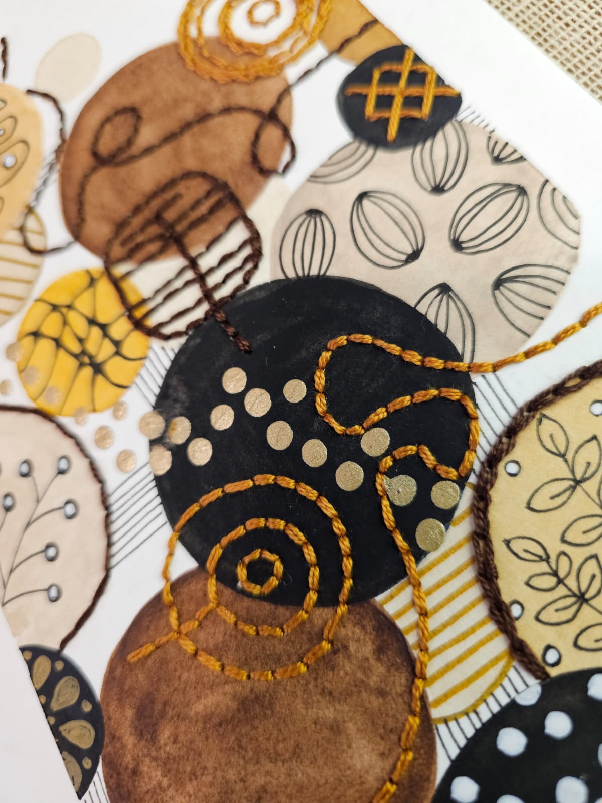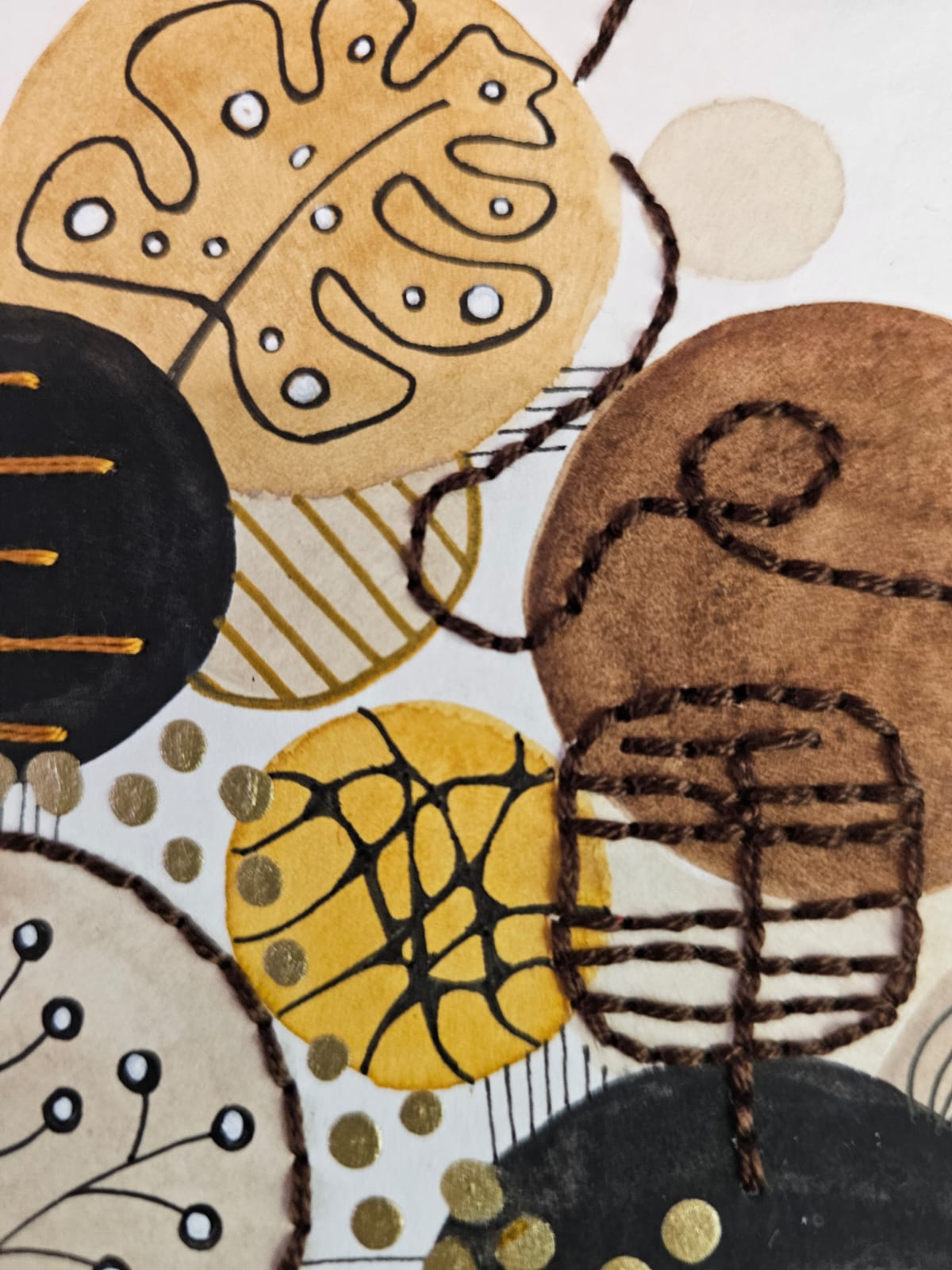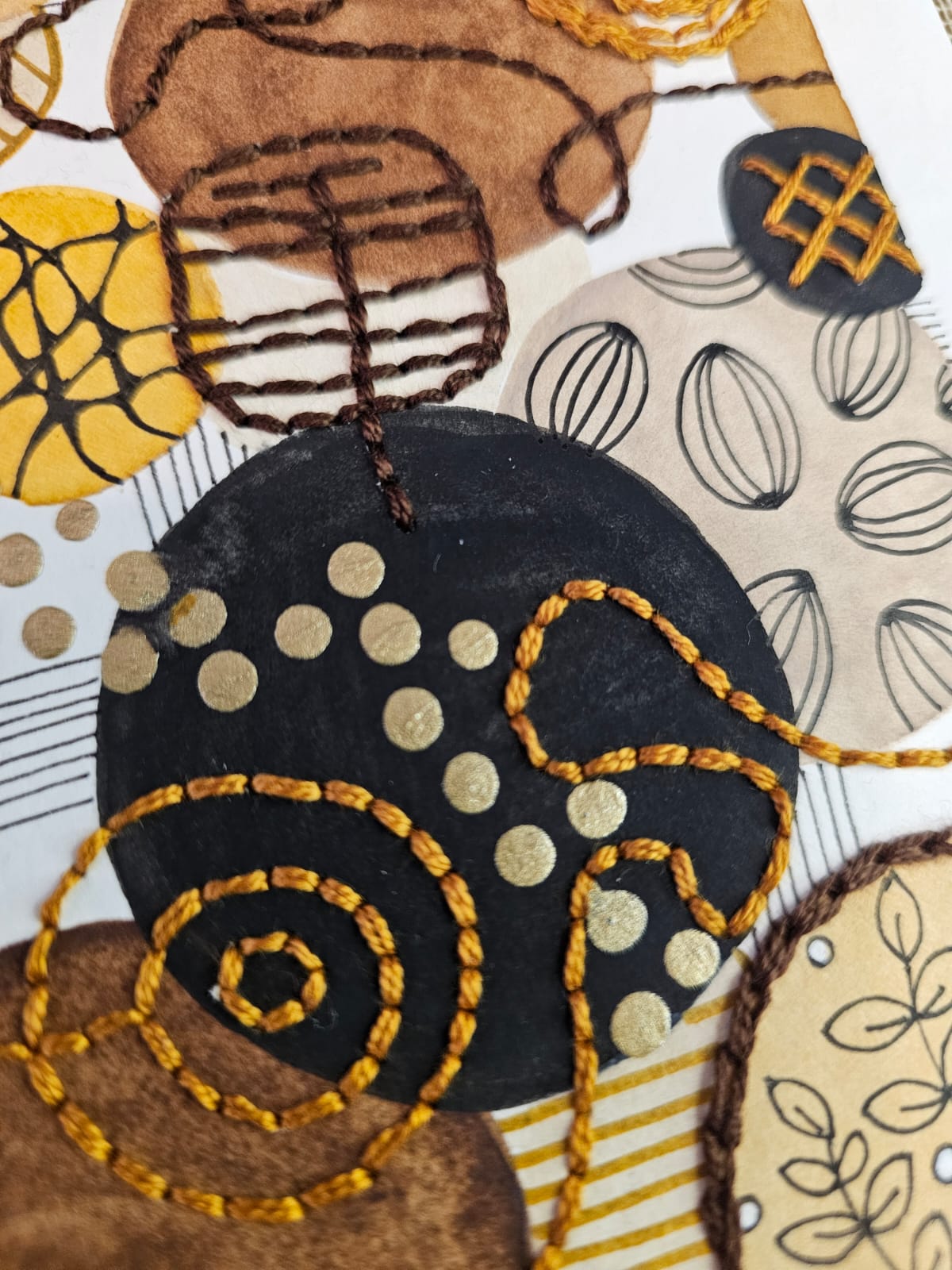 Técnica mixta Acuarela intervenida con bordados en hilo de algodón, recortes de papel, tinta y pintura acrílica.
