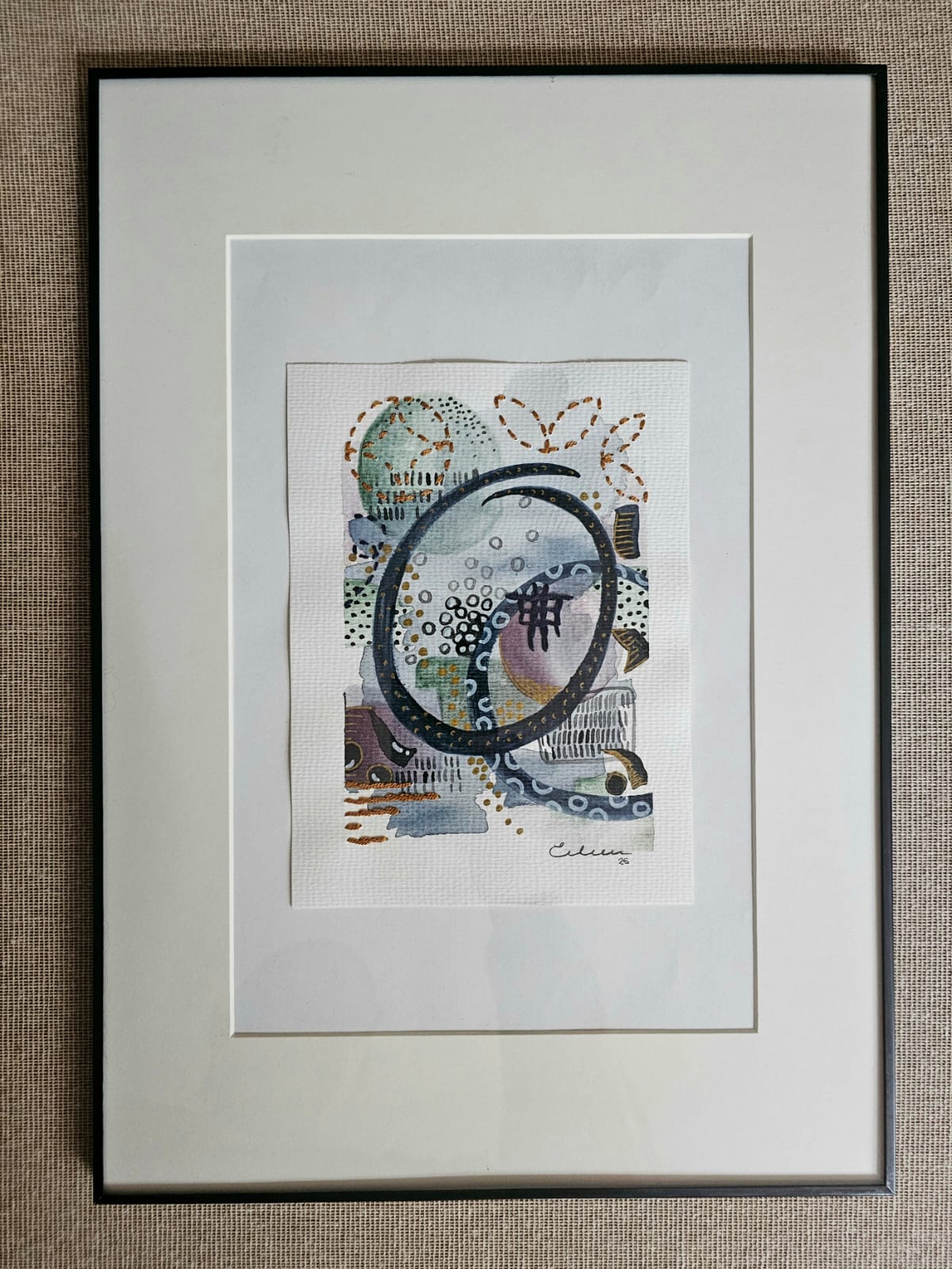 Técnica mixta acuarela intervenida con hilo de algodón, tinta y acrílico