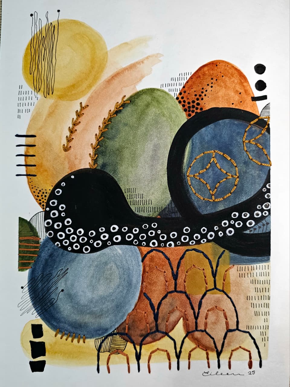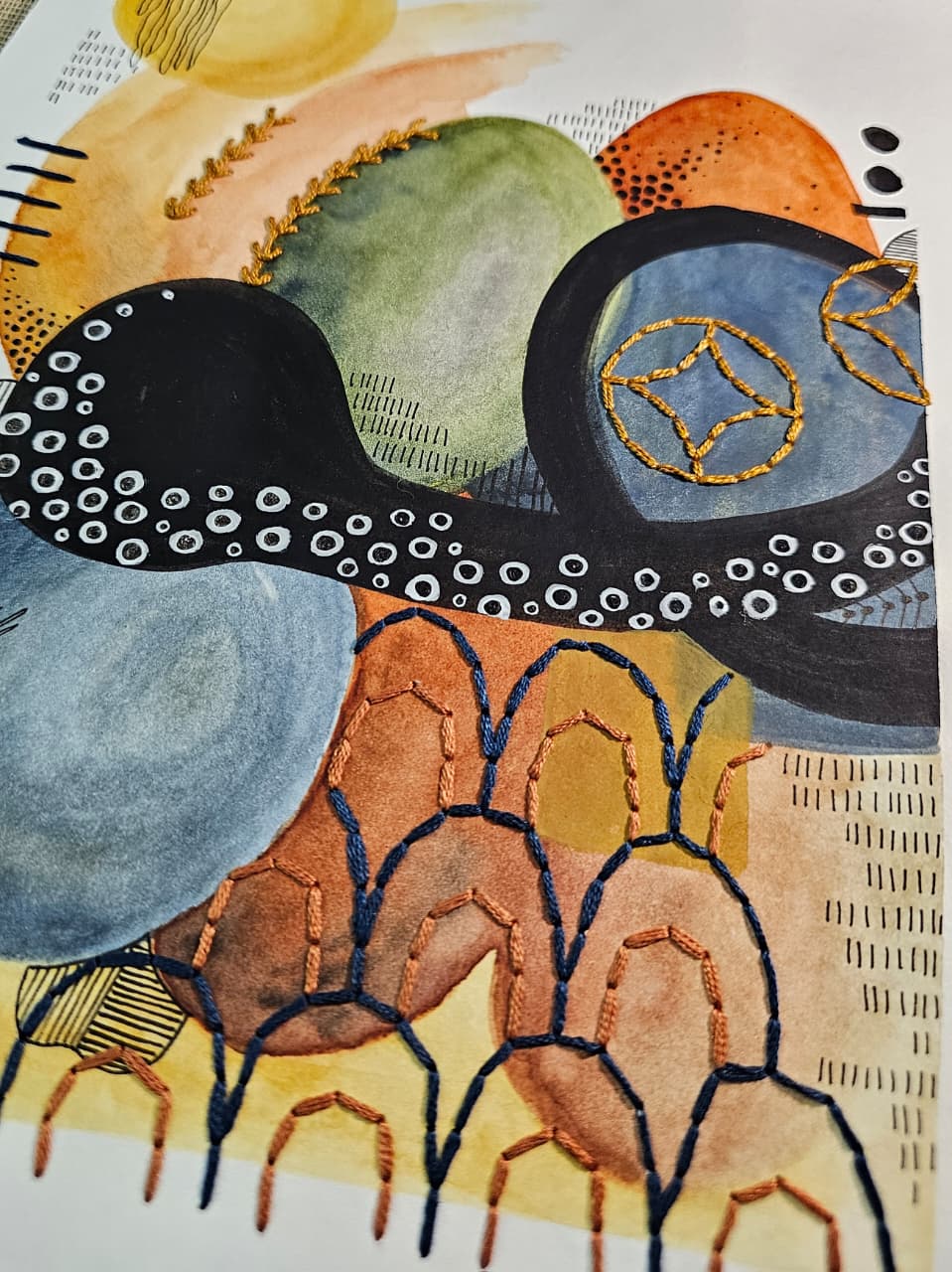 Tecnica mixta Acuarela sobre papel libre de acido, bordado con hilo de algodon, tinta, y pr
