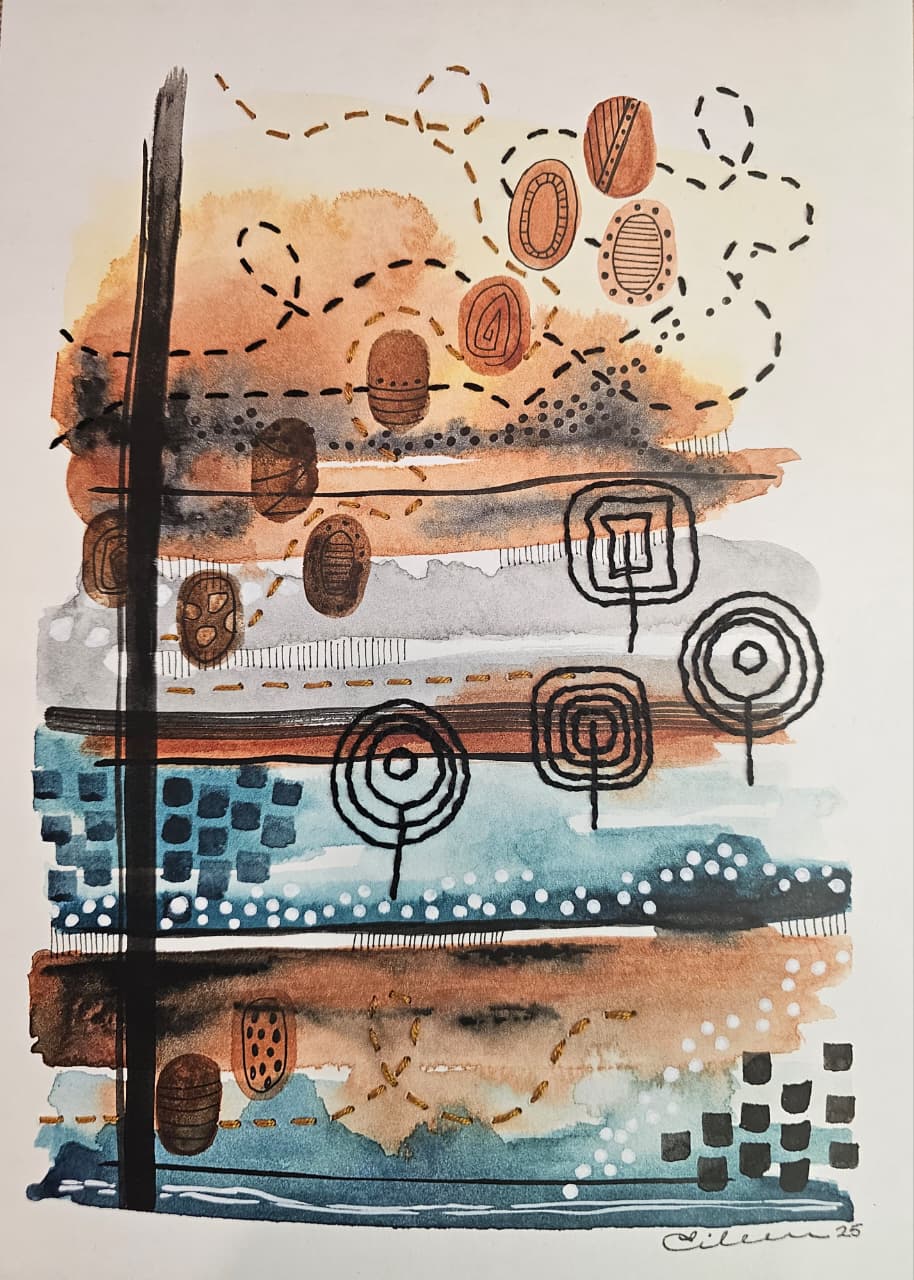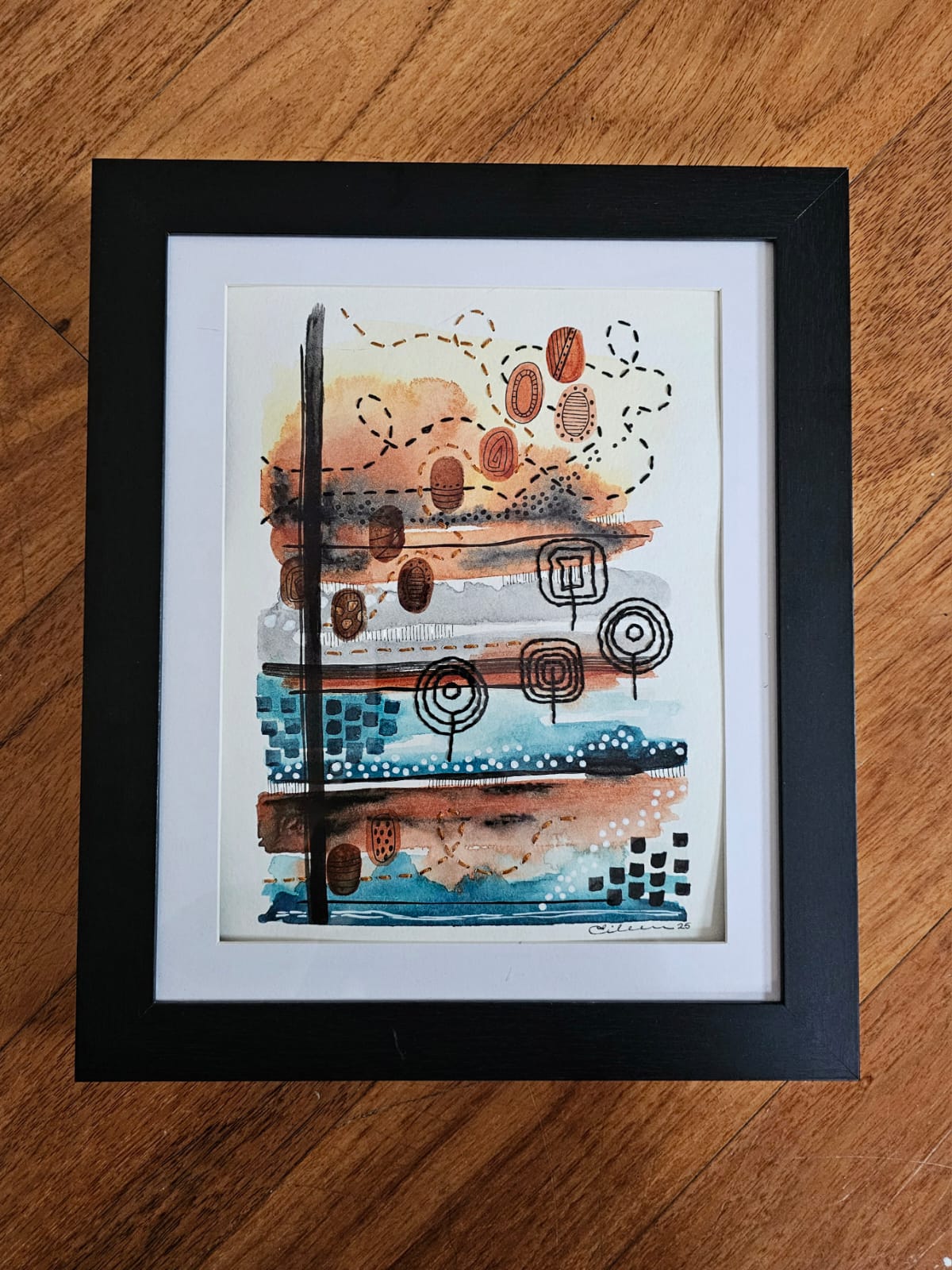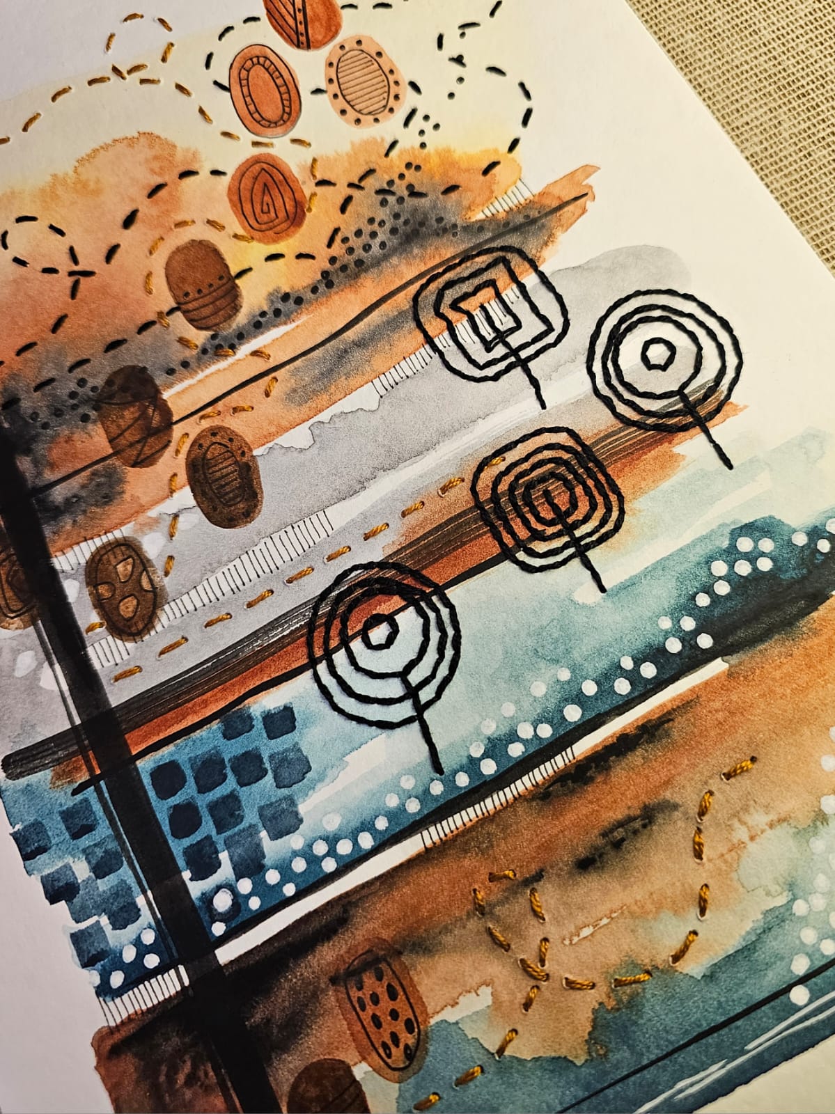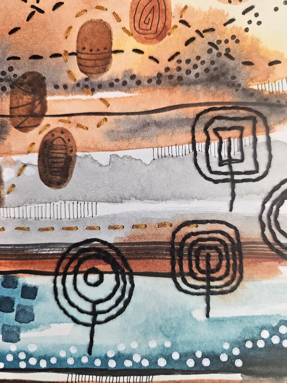 Tecnica mixta Acuarela sobre papel libre de ácido, bordado con hilo de algodón, tinta y a acrílico.
