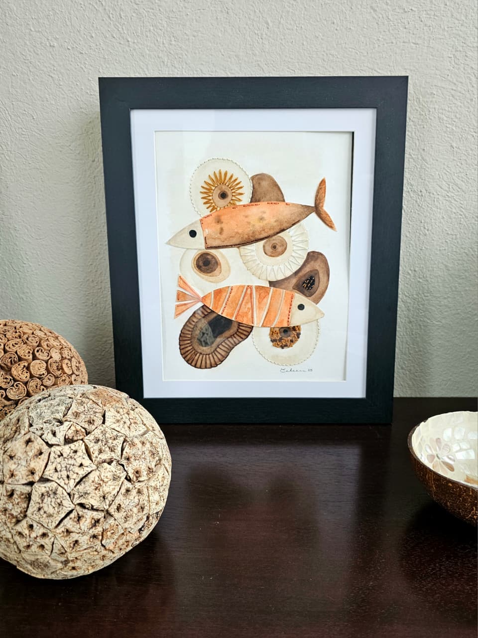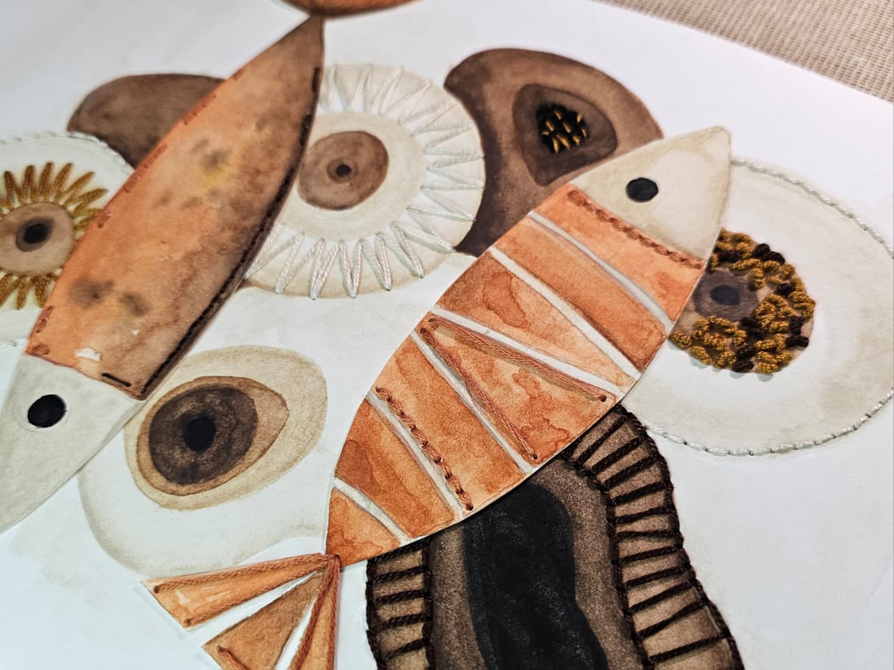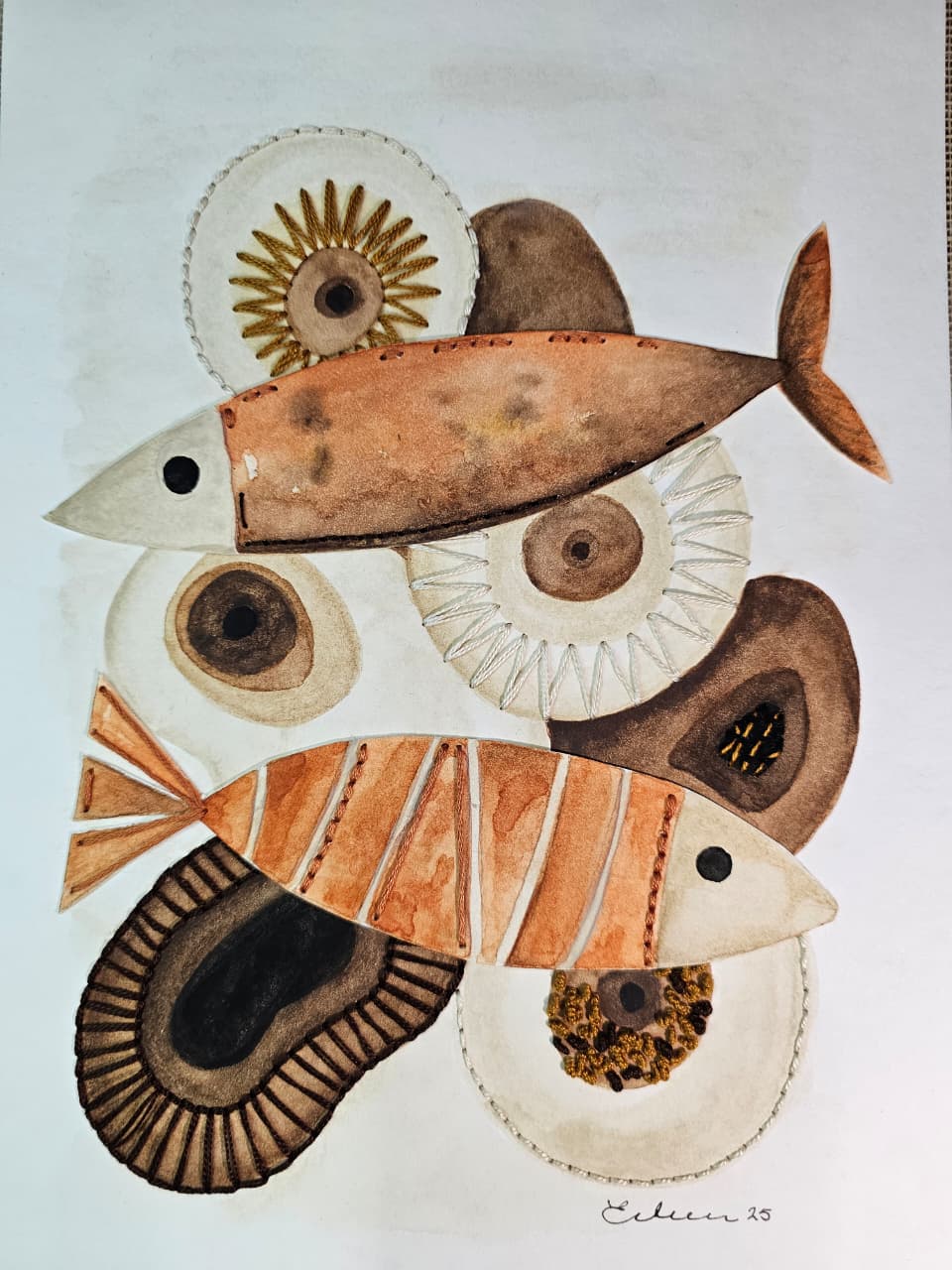 Acuarela sobre papel libre de ácido, bordado con hilo de algodón.