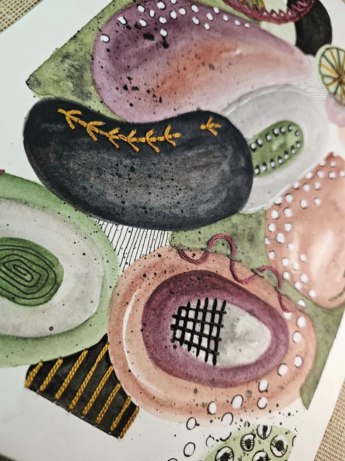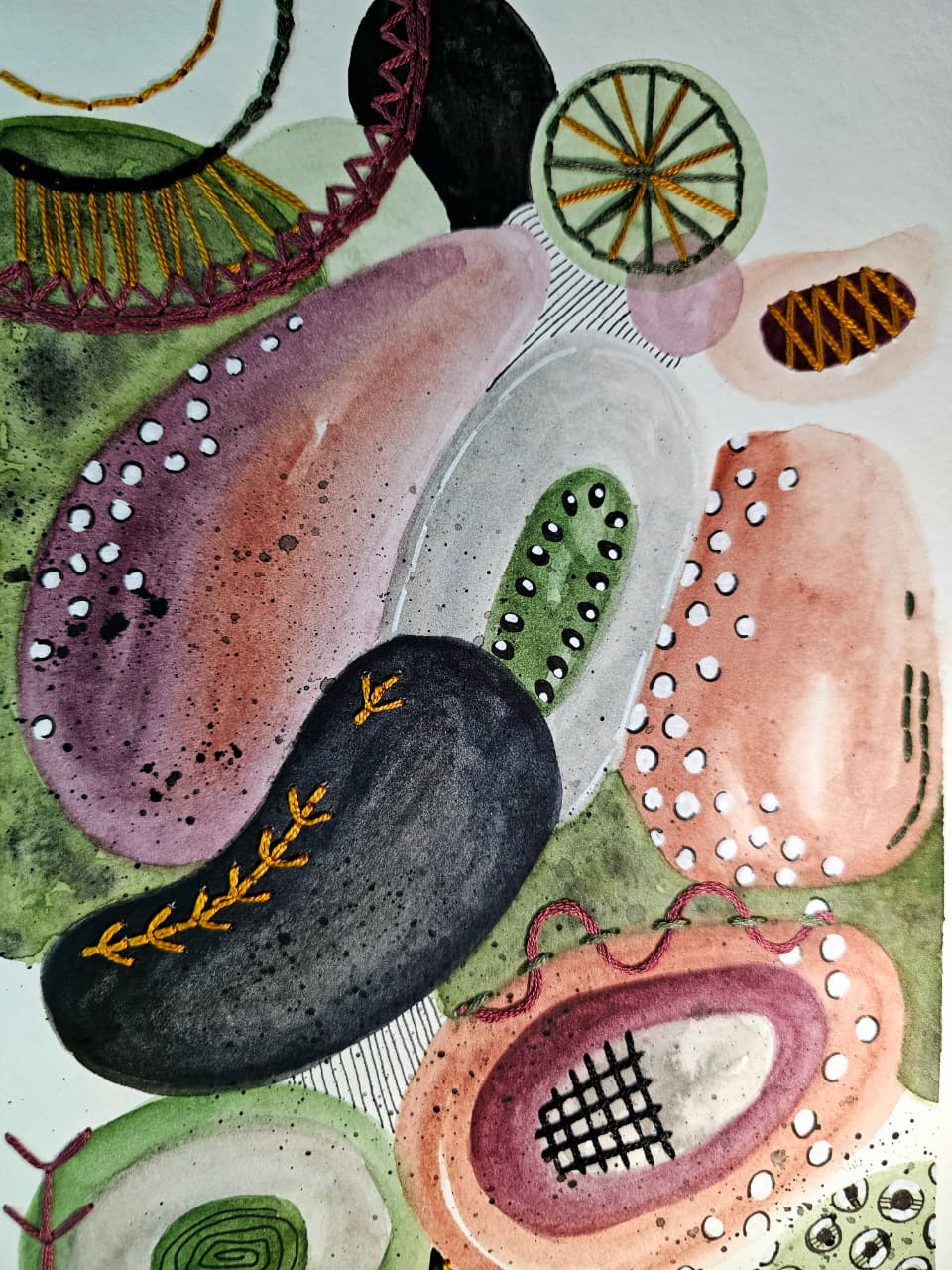Acuarela sobre papel libre de ácido y bordado con hilo de algodón, tinta y acrilico.