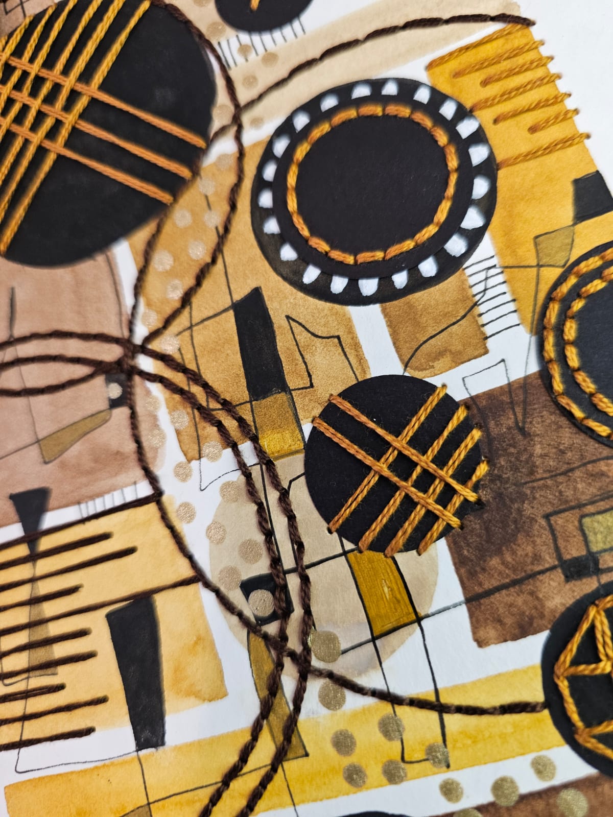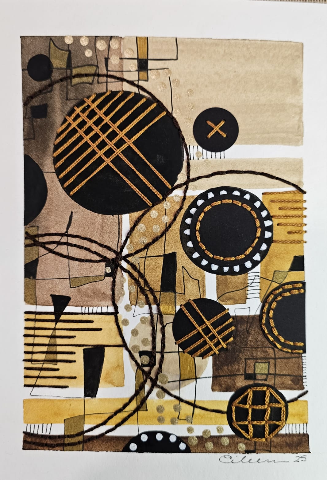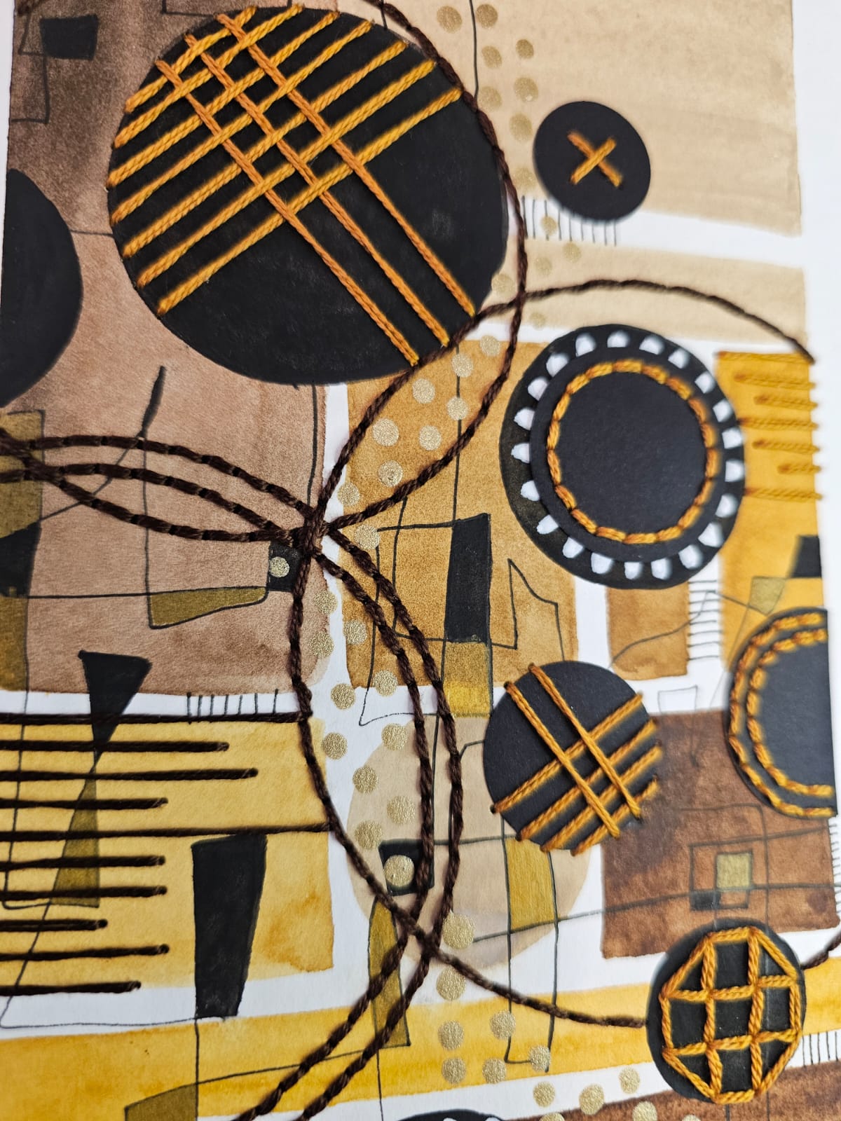 Técnica mixta Acuarela intervenida con bordado recortes de papel, tinta y pimtura acrílica.