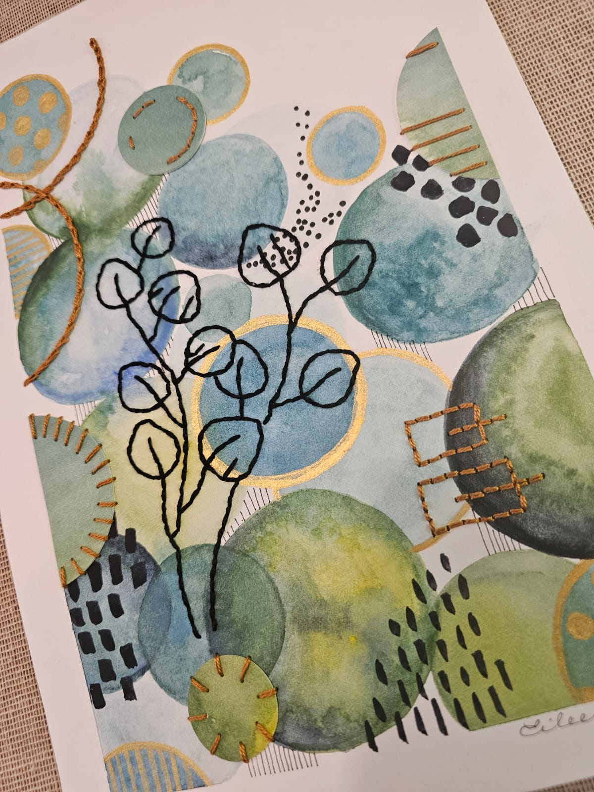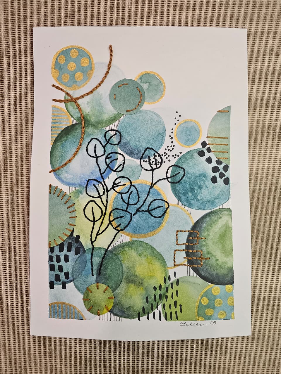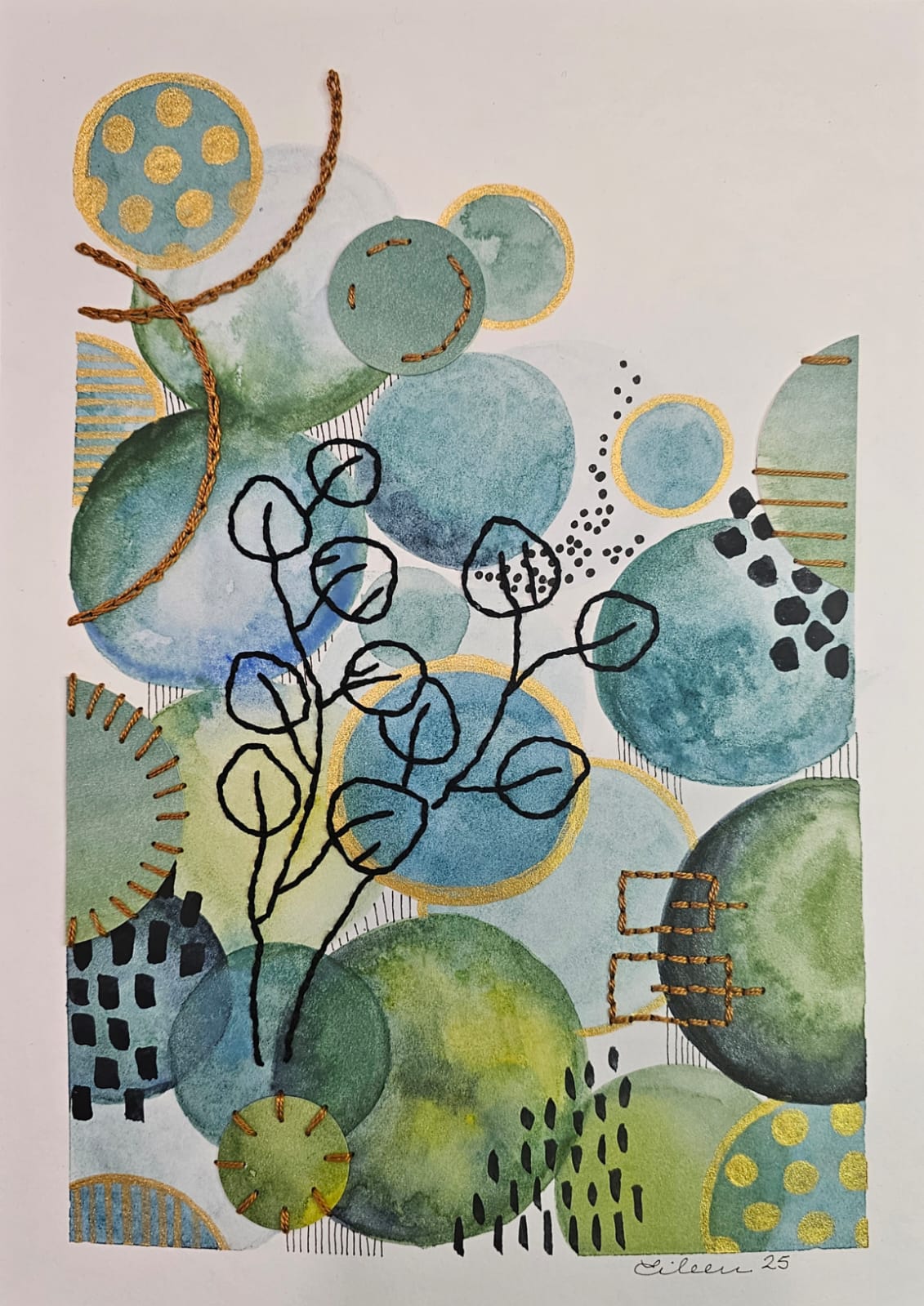 Tecnica Mixta Acuarela sobre papel libre de ácido, bordado con hilo de algodón, tinta y acrilico dorado.