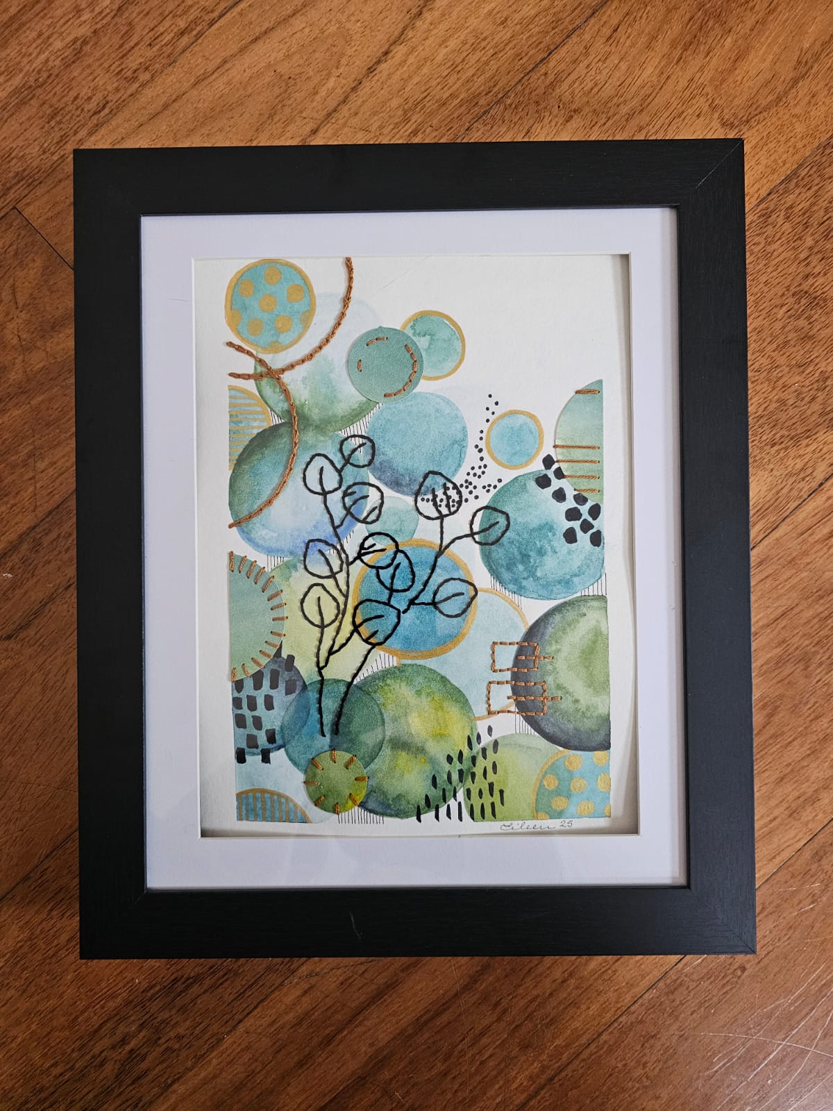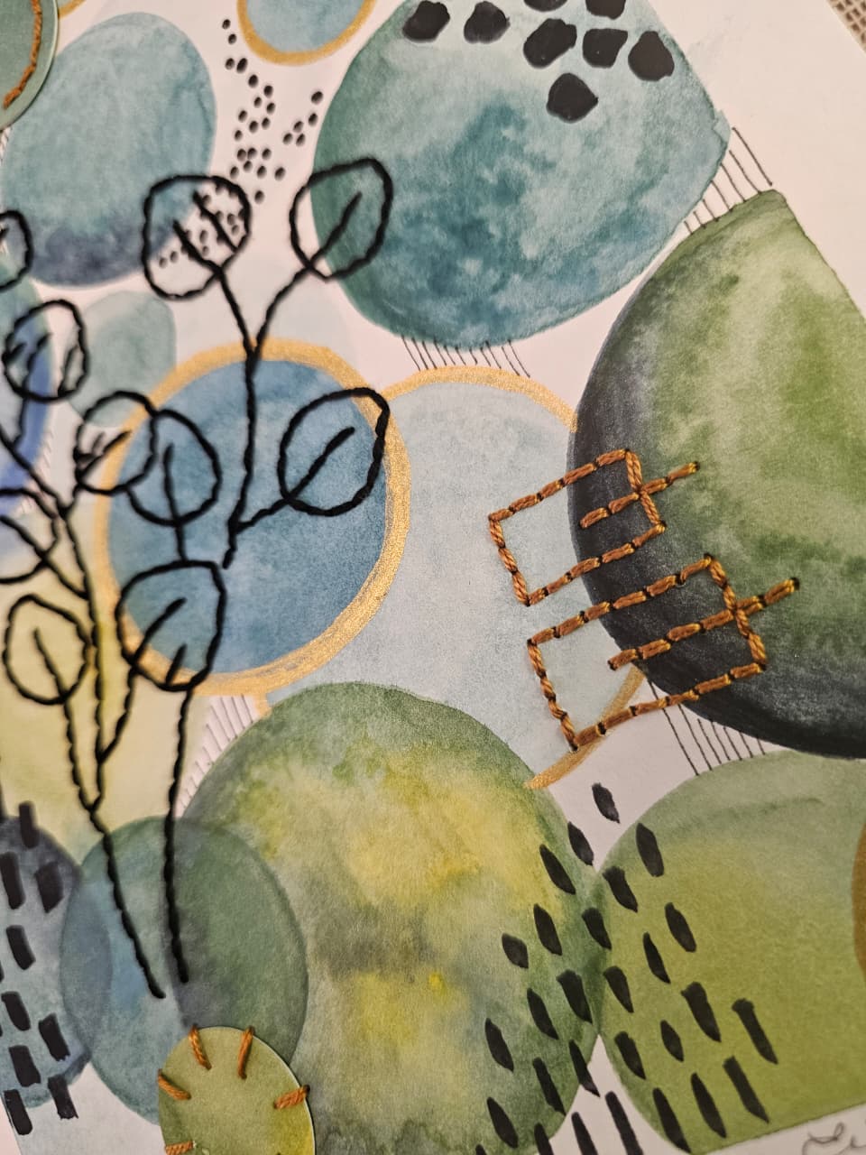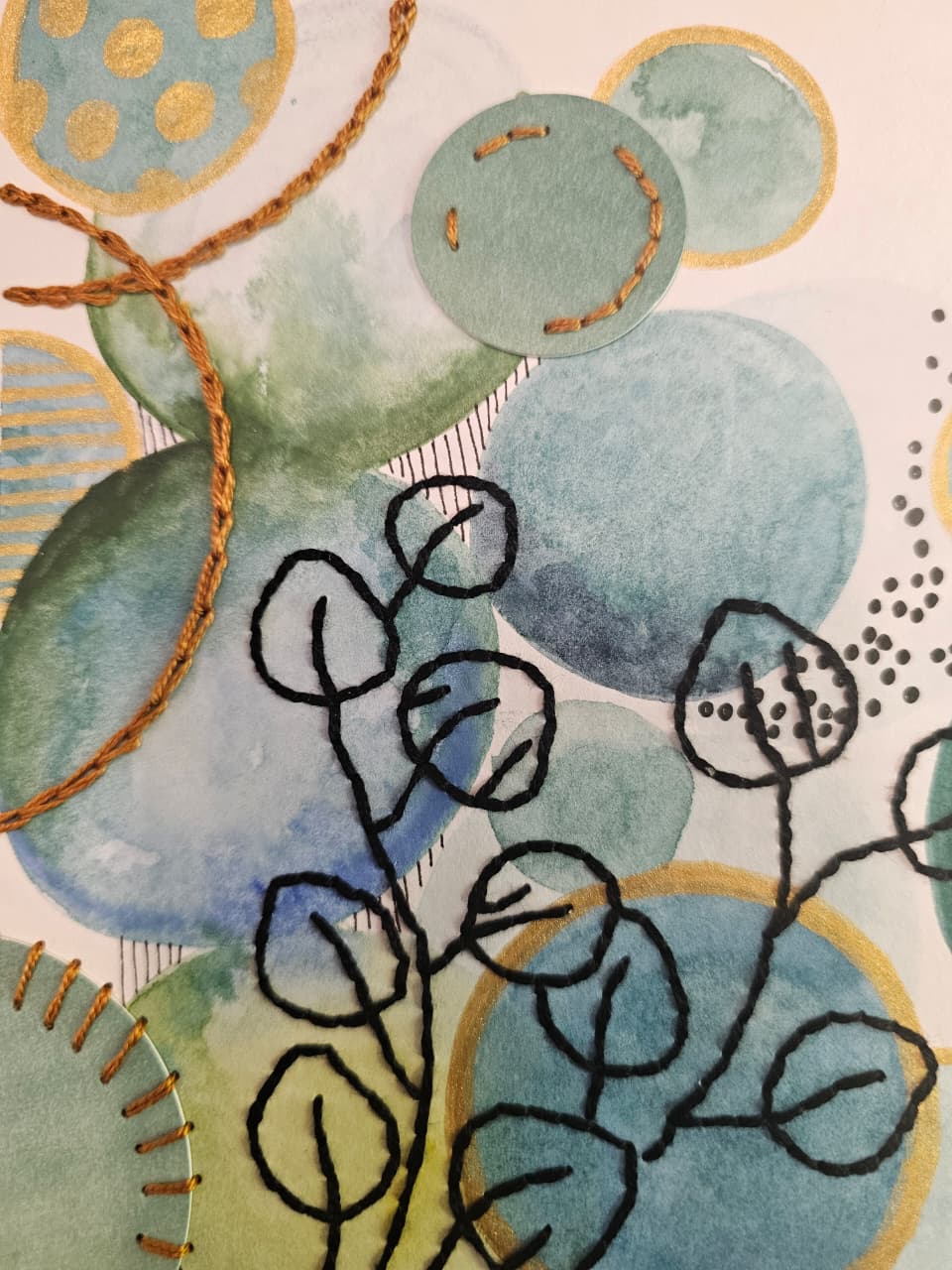 Tecnica Mixta Acuarela sobre papel libre de ácido, bordado con hilo de algodón, tinta y acrilico dorado.