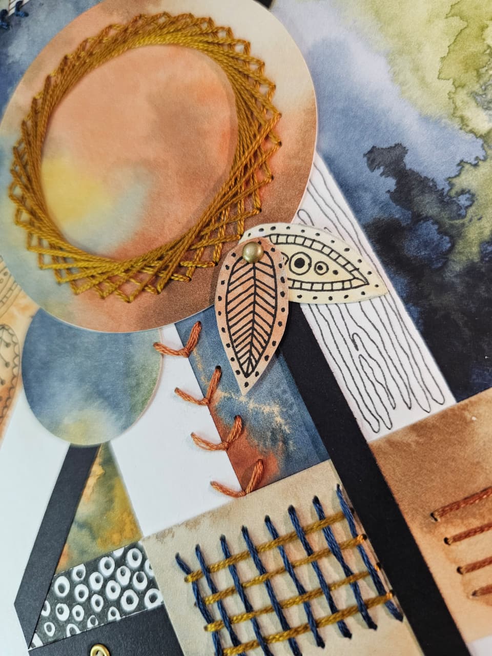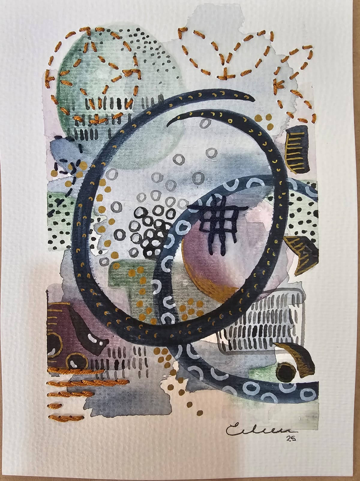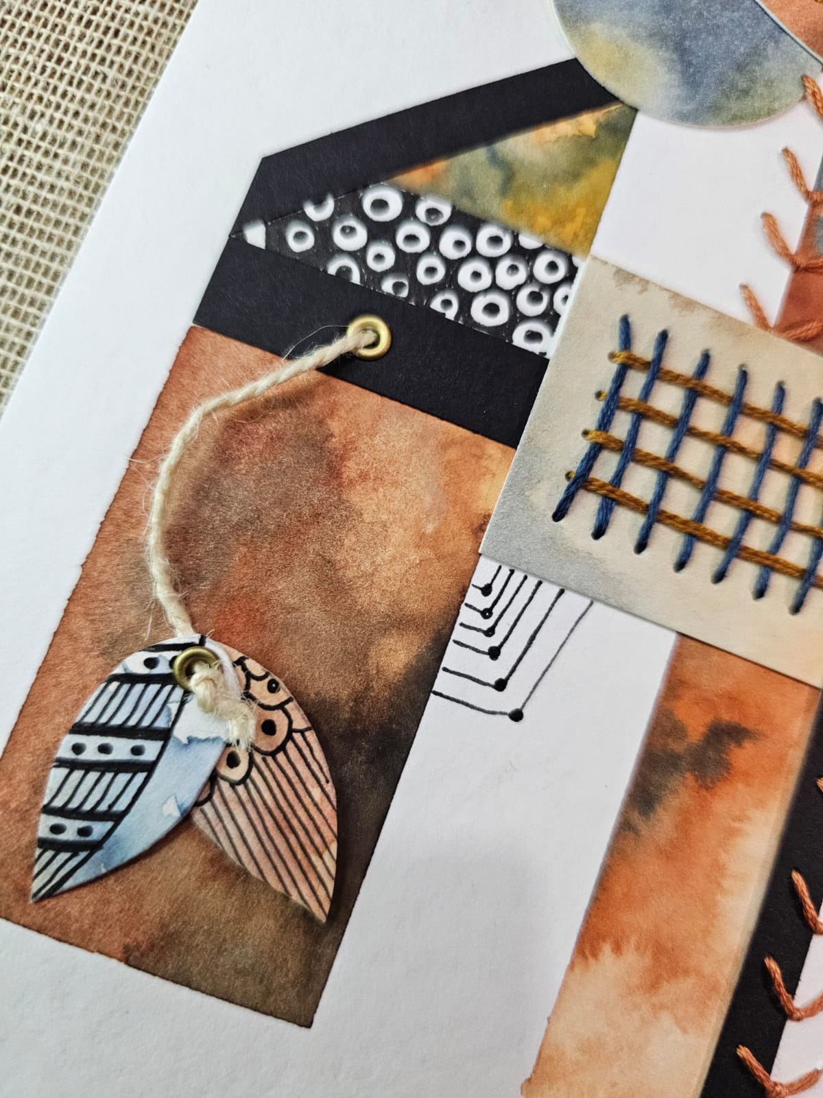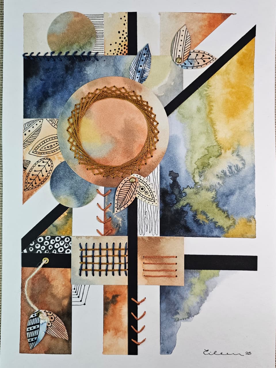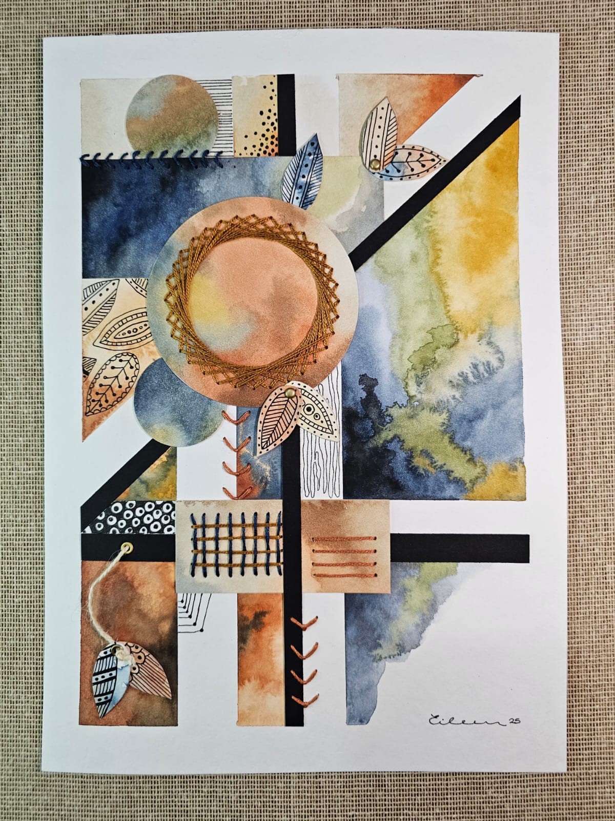 Acuarela sobre papel libre de acido, bordado con hilo de algodón, cuerda de yute, y eyelet.